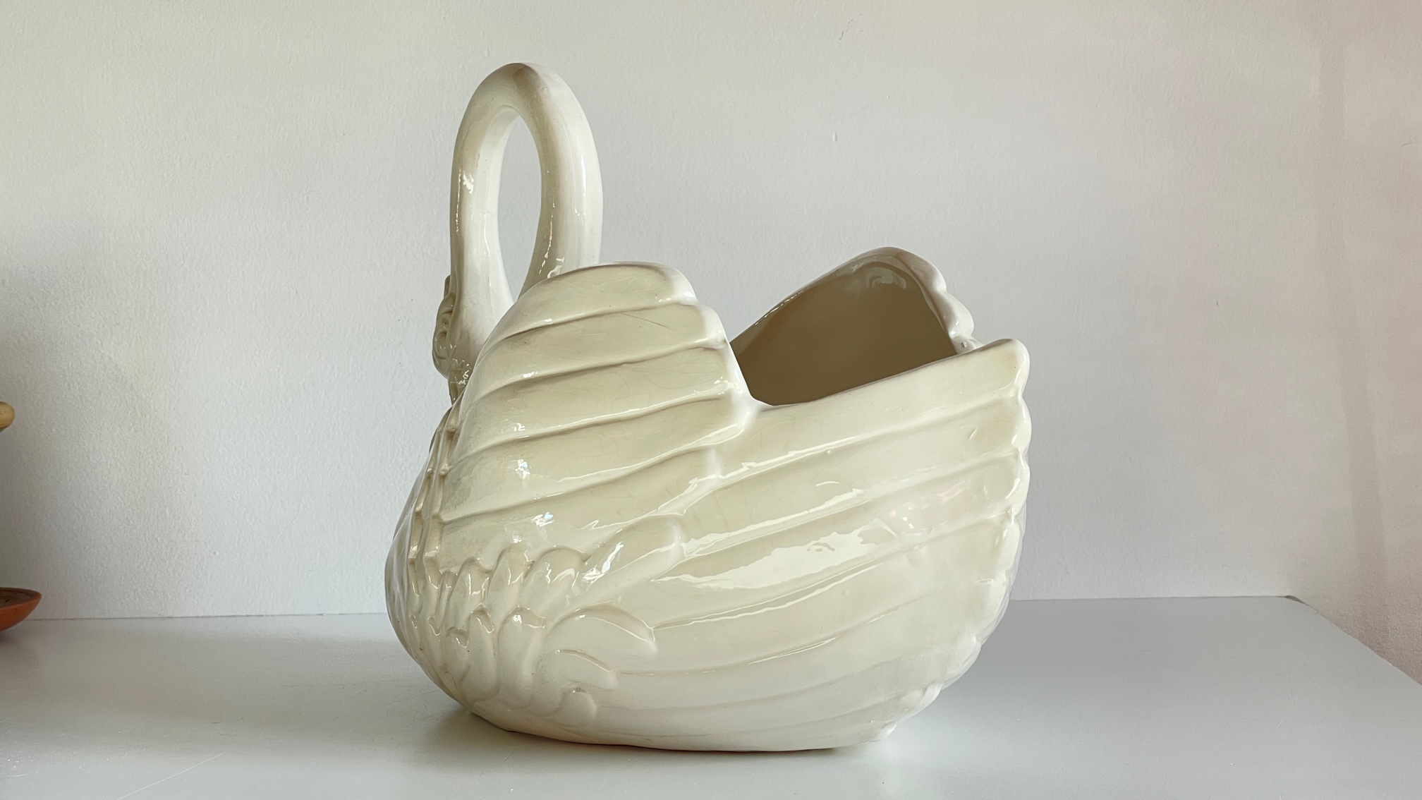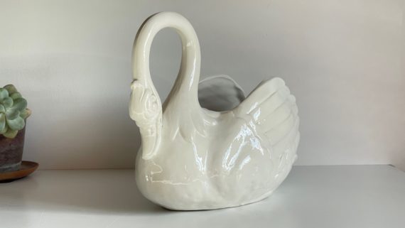 Très beau Cache-POT forme CYGNE en Céramique émaillée Blanche, estampillé “N Couronné – Capodimonte Napoli – ITALIE”, 1 grande Céramique de très belle facture pour vos Plantes mais aussi pour le Rangement, comme Vides Poche pourquoi pas, ou pour la Salle de Bain … 1 Accessoire Chic et rempli de Poésie.